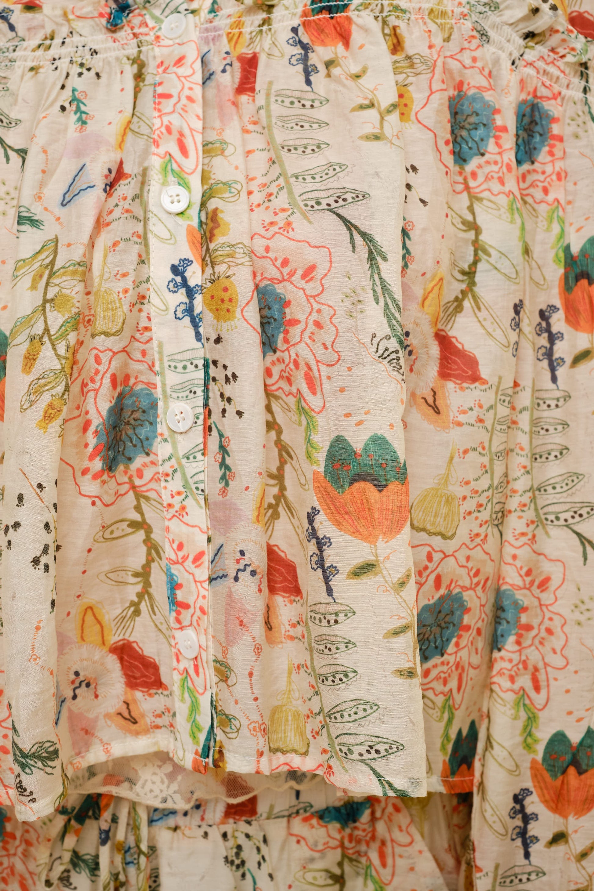 Flowy printed top featuring a soft mock neckline, delicate ruffle detailing along the yoke, and long balloon sleeves with gathered cuffs. The lightweight fabric creates an airy, relaxed silhouette with gentle drape. 100% Polyester Model is 5'8" tall and wearing size Small