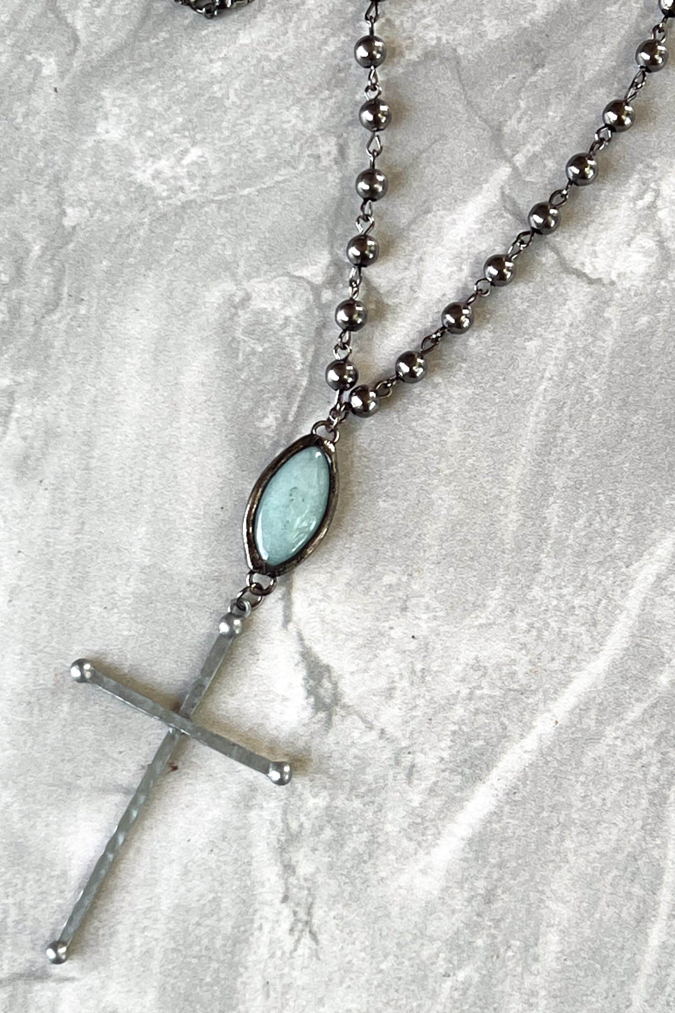 Long chain necklace with hematite beads and a 2 inch extender. Features a beautiful stone and thin cross at the bottom.