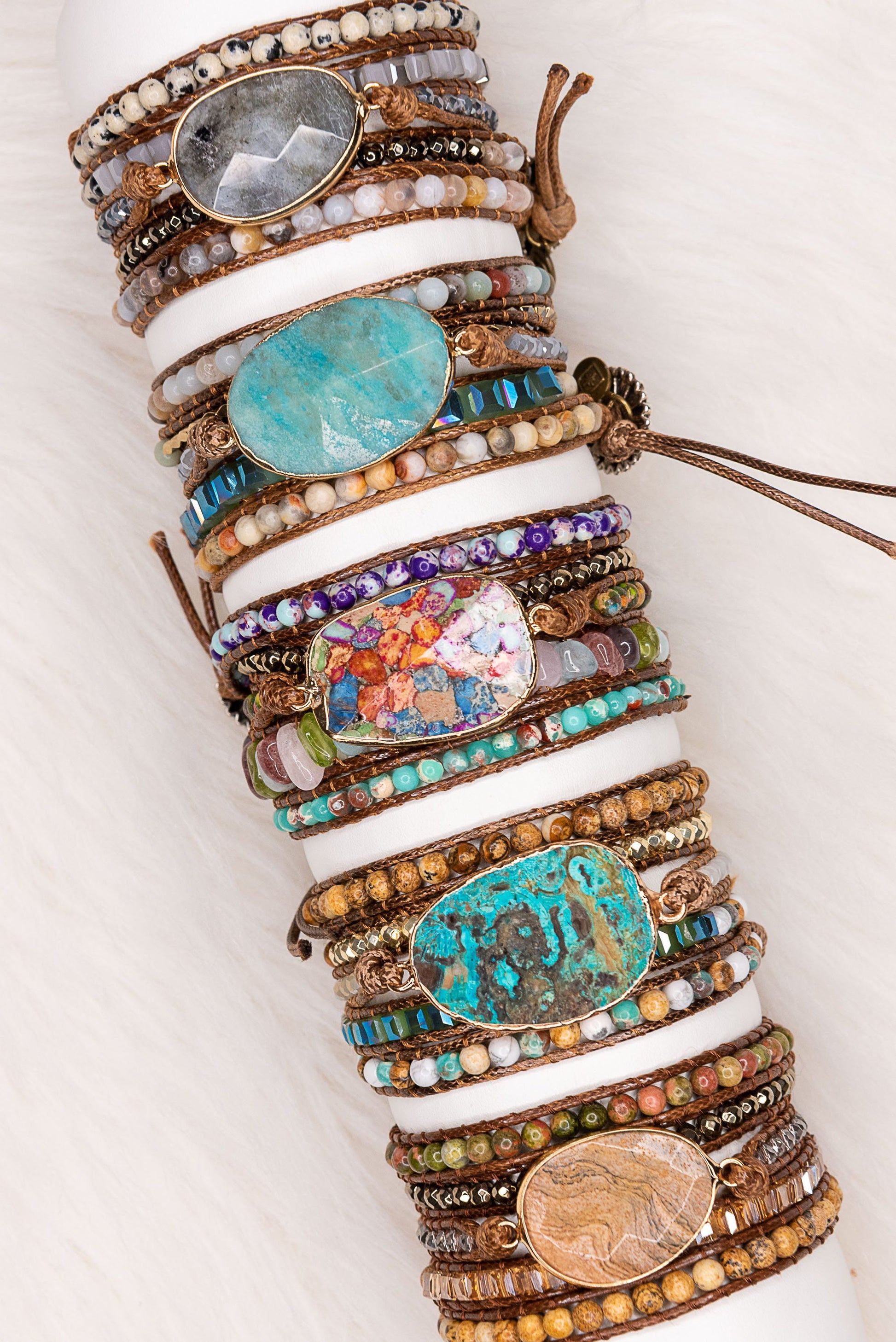 Long, thin brown vegan leather strand that wraps around wrist multiple times. In addition, a large aqua stone charm with with natural stones/beads and silver sunflower closure.