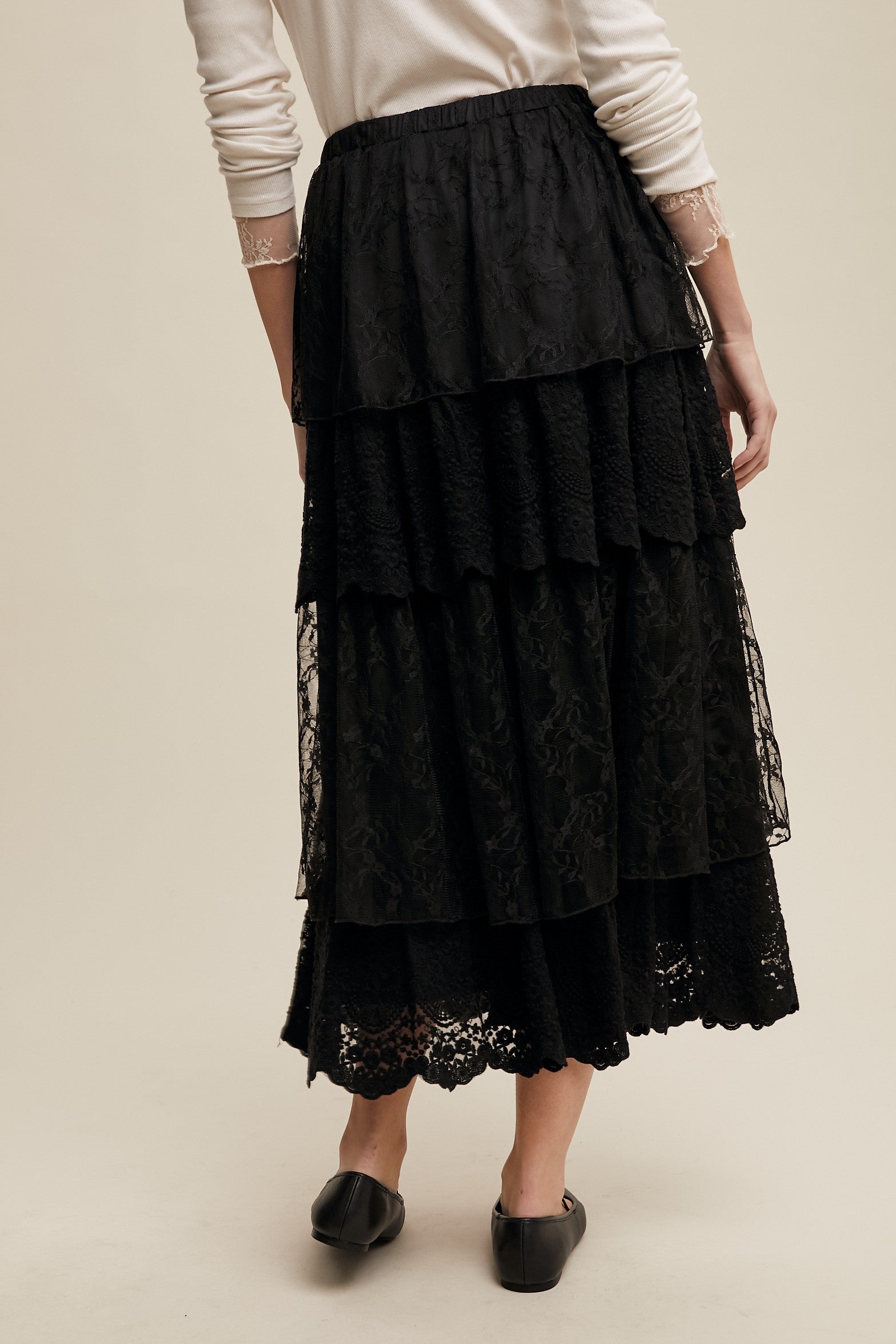 - Elegant Lace Overlay: Features a delicate and intricate lace overlay, adding a touch of sophistication and femininity. - Layered Design: Designed with multiple flowing tiers that create a voluminous and flattering silhouette. - Satin Bow Accent: A charming satin bow detail at the waist enhances the skirt's romantic aesthetic. - Elastic Waistband: Equipped with a comfortable elastic waistband for a secure and adjustable fit. - Scalloped Hemline: The scalloped hemline adds a refined and luxurious finishing touch. - Lightweight Fabric with Lining: Crafted with breathable and lightweight fabric and includes a full lining for added comfort and modesty. - Model is 5' 10" 34-26-36 and wearing a size Small Perfect for formal occasions, garden parties, or a romantic evening, this lace tiered maxi skirt pairs beautifully with heels and a fitted blouse for an effortlessly chic look.