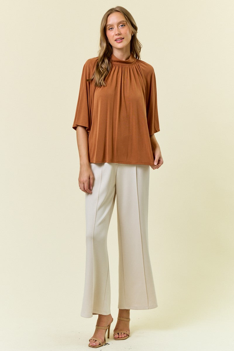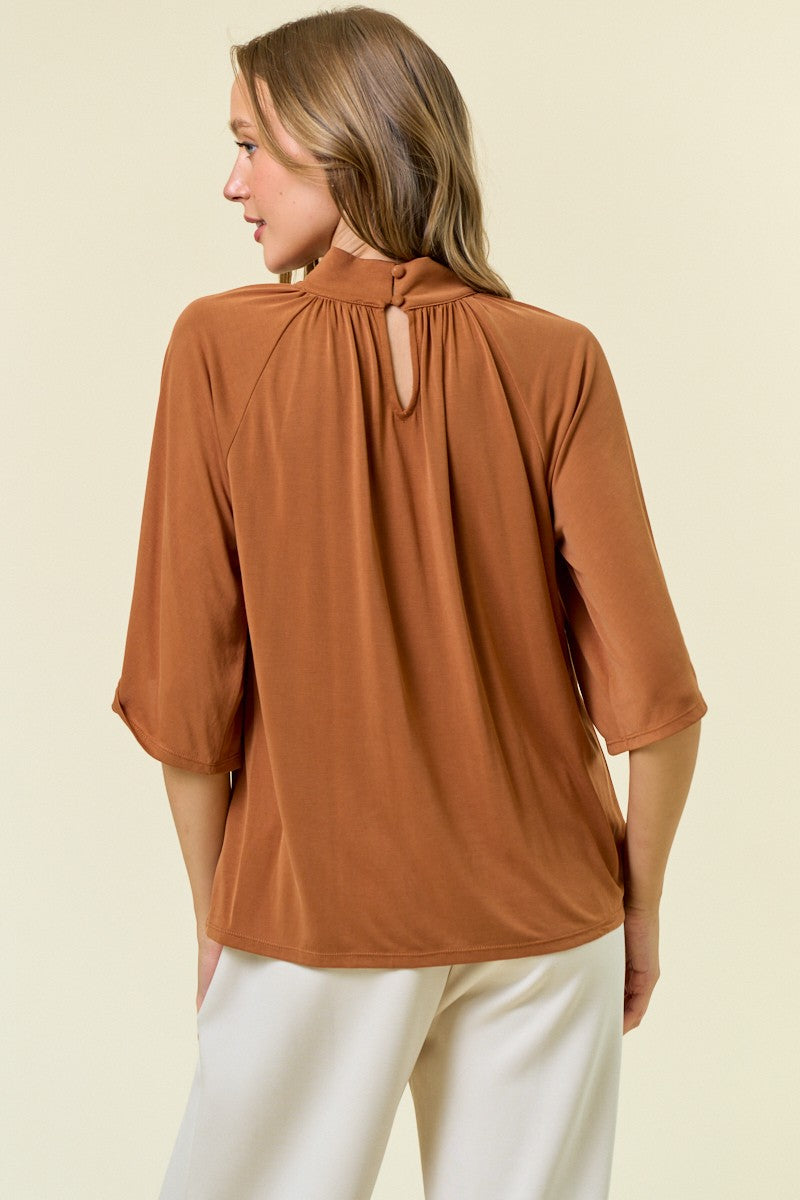 MODAL JERSEY MOCK NECK FLUTED SSLV TOP - Crafted from ultra-soft modal jersey fabric for a comfortable, breathable feel - Features a modern mock neck design with gentle gathers for a refined silhouette - Fluted short sleeves provide a relaxed, airy fit and elegant drape - Loose, easy fit through the body for versatile styling and all-day comfort STYLE MEASUREMENTS (SIZE SMALL) - TOTAL LENGTH 24" - BUST 21 1/2" - SLEEVE LENGTH 16" 80%MODAL, 20%POLYESTER MODEL IS 5'10" | BUST 34" | WAIST 24" | HIPS 35" WEARING SIZE S
