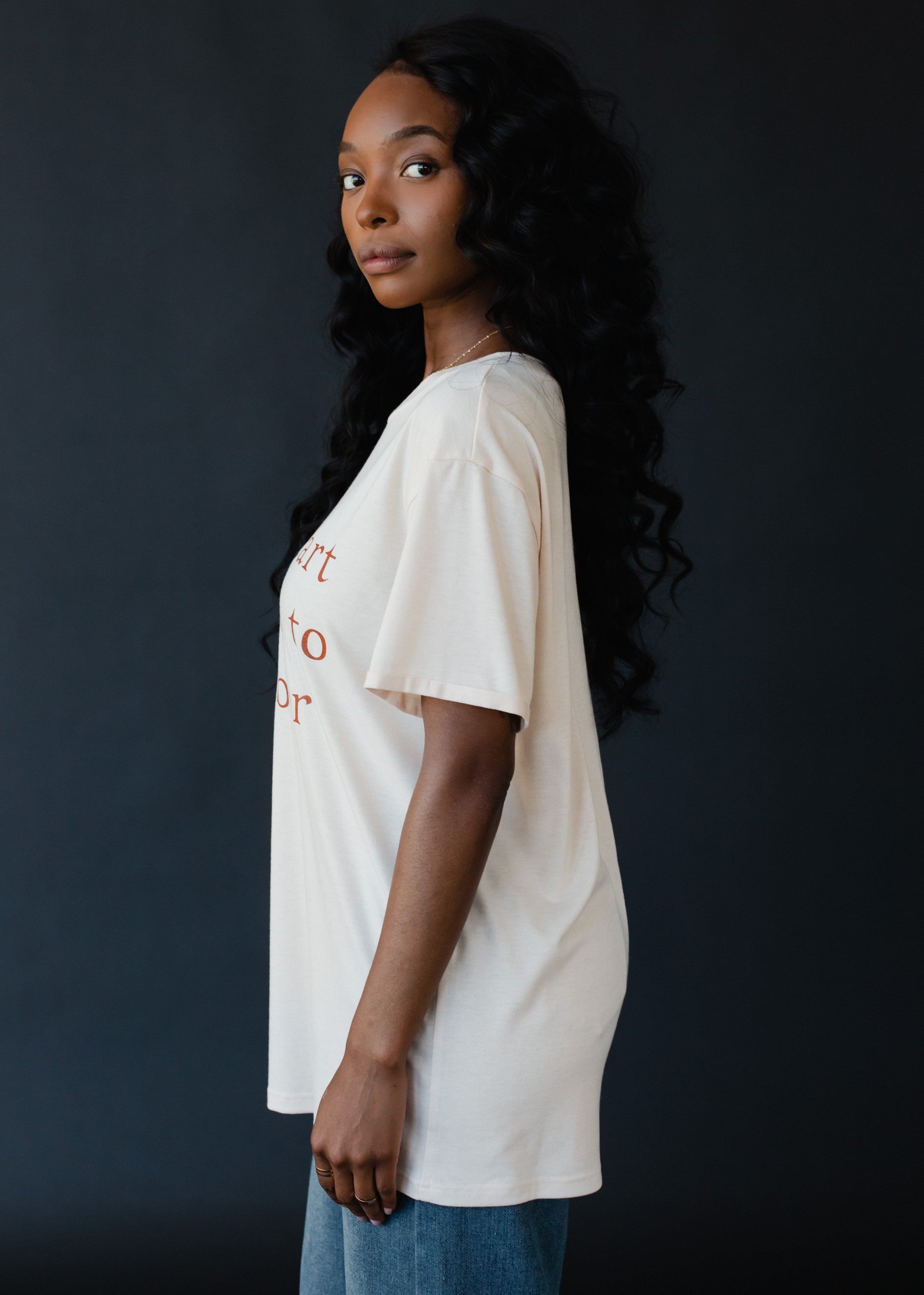 Tan graphic tee Rust "My heart belongs to October" text 60% Polyester / 35% Rayon / 5% Spandex