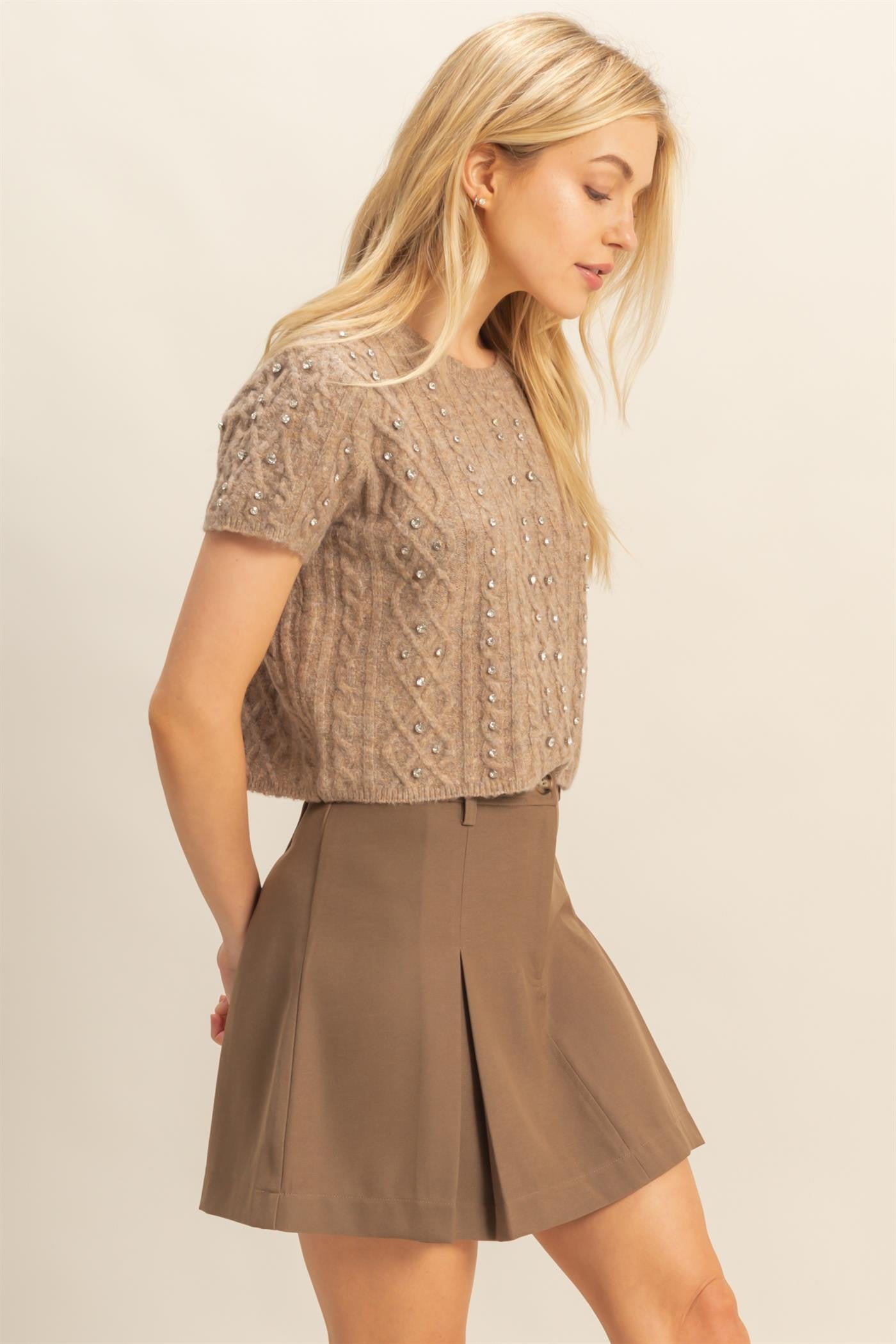 This sweater top captures elegance with its dazzling array of rhinestone embellishments. Crafted for comfort and a hint of glamour, it features a subtle texture and short sleeves, perfect for transitioning from office chic to evening glam seamlessly. The refined fit accentuates the silhouette, offering a sophisticated look for any occasion. 75% Acrylic 20% Polyester 5% Spandex Model Is 5' 6" Tall, 32" Chest, 24" Waist, 32" Hips And Wearing A Size Small