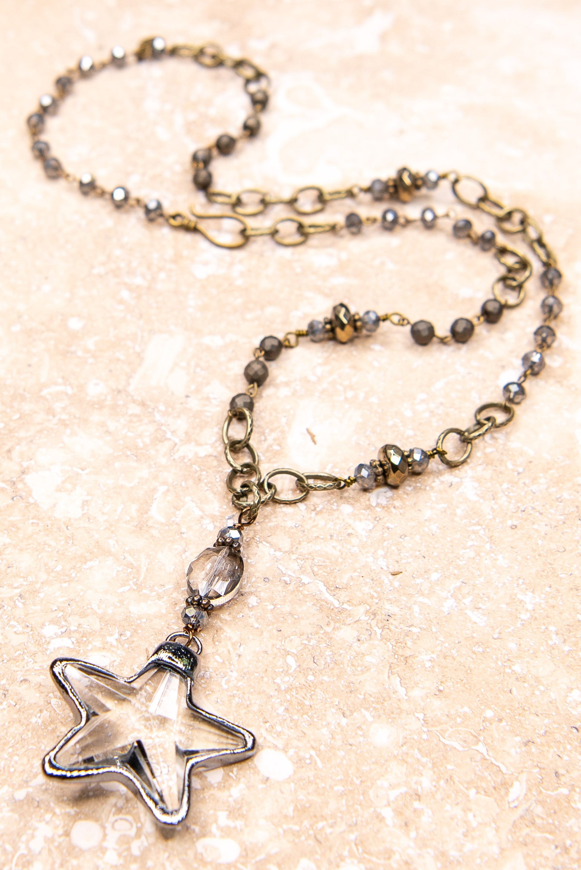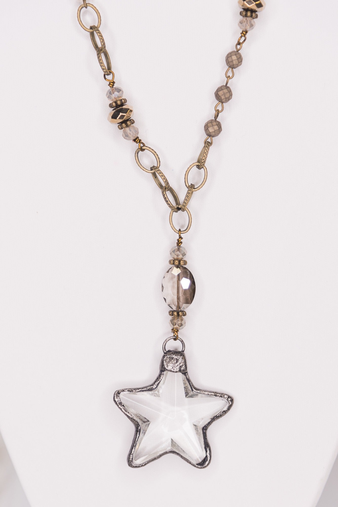 Long chain necklace with hook closure on the side and large star-shaped crystal pendant.