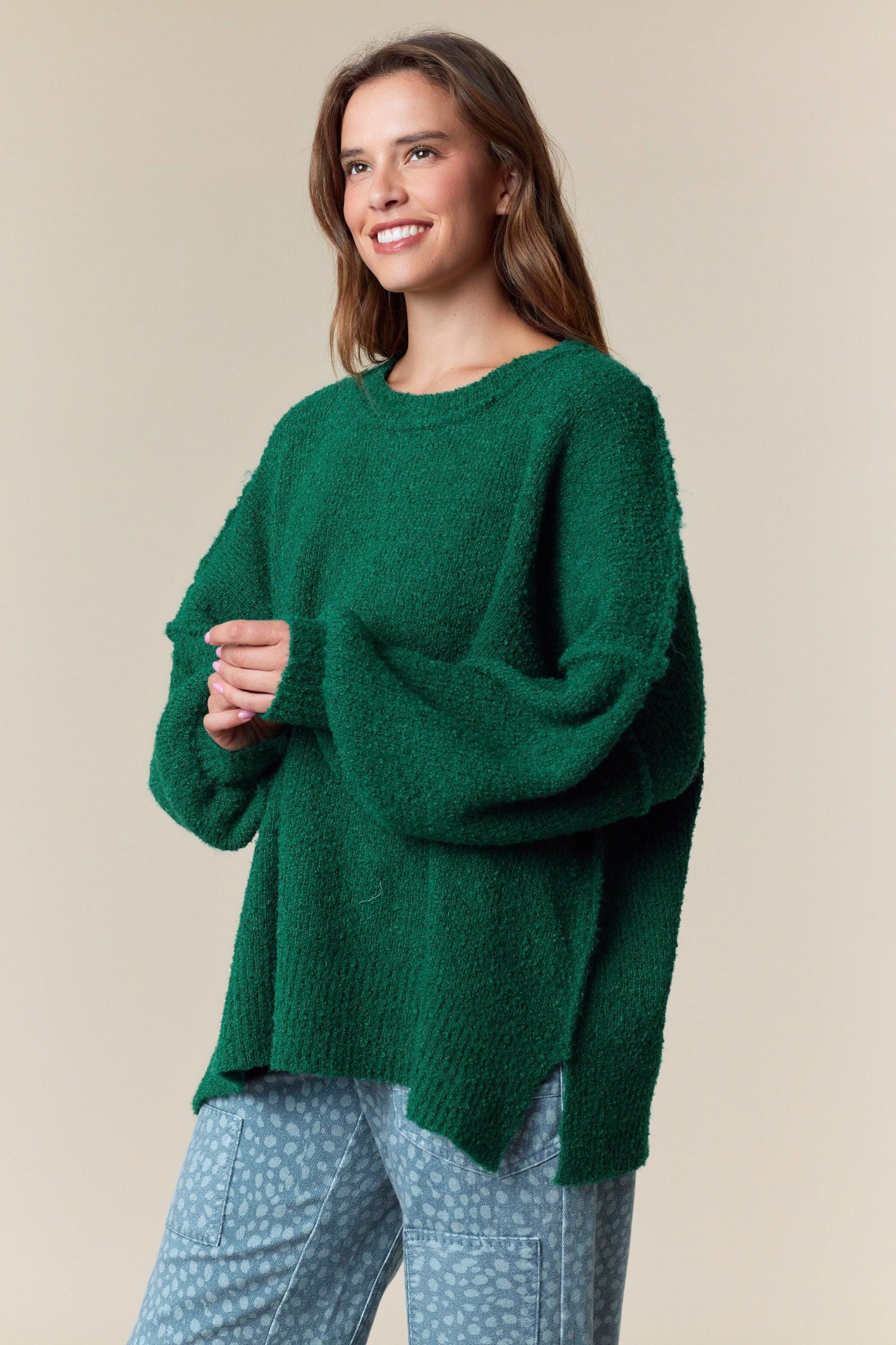 Product Name: Long Sleeve Knit Sweater Top Product Category: Sweaters Size: The Model is Wearing a Size Small. (HEIGHT: 5'8" / BUST: 32B / WAIST: 25.5'' / HIPS: 37.5'') Material: 100% Polyester